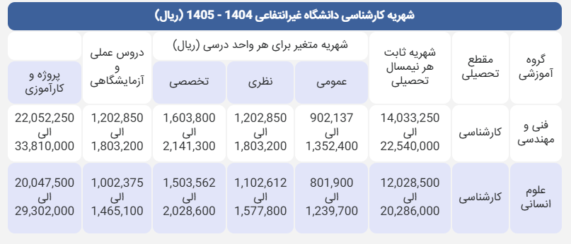 با توجه به اهمیت تناسب هزینه های تحصیلی با توان مالی افراد، بررسی جدول میزان هزینه 1404 پیش از انتخاب رشته ضروری به نظر می رسد. متقاضیان می توانند با مطالعه دقیق این جدول تصمیم آگاهانه تری درباره ادامه تحصیل اتخاذ نمایند. در این مقاله، جزئیات کامل مربوط به شهریه دانشگاه غیرانتفاعی 1404 - 1405 ارائه خواهد شد.